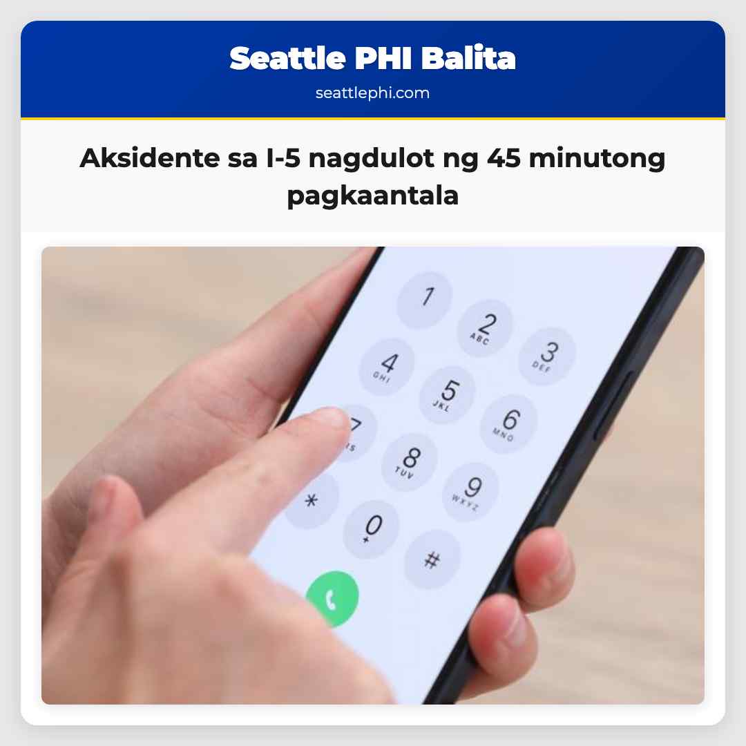 Naiulat ang 45-minutong pagkaantala sa trapiko sa I-5 pahilaga malapit sa Seattle. Nagsimula ang pagkaantala sa umaga at naging isang bansag para sa mga manlalakbay at mga kumpanya na nagsisimula sa kalsada. Ang mga tao ay nagsasabi na ang pagkaantala ay naging isang kahon para sa kanilang araw, partikular na para sa mga naglalakbay pwesto sa kabisera. Ang mga pulis ay nagsasabi na ang kalsada ay nasa proseso ng pagpapalayag, ngunit ang mga tao ay nagsasabi na ang pagkaantala ay maaaring magdulot ng mas dakilang epekto sa araw ng mga tao.