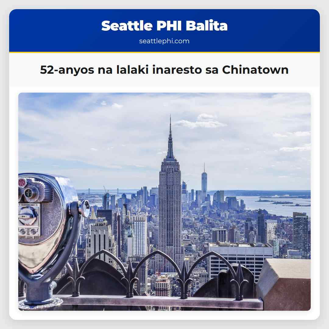 Nararating ang isang 52-anyos na lalaki na may isang akusasyon ng pag-atake sa tao at may isang sako na kutsilyo sa kanyang balat sa Chinatown-International District ngayong umaga. Ang mga pulis ay nakita ang lalaki sa kahabaan ng 5th Avenue nang malapit na 1:30 a.m. Ayon sa ulat ng pulis, siya ay nag-uugali na nag-iisip na may isang ‘fixed blade knife’ na naka-iskorpon sa kanyang paa. Ang mga pulis ay nagsimula nang magtanong at nang makita nila ang $5,000 na akusasyon para sa pag-atake, inaresto nila siya at inilagay sa King County Jail. Ang pulis ay nagsabi na ang lalaki ay may isang akusasyon para sa pag-atake sa tao at may isang sako na kutsilyo sa kanyang balat sa Chinatown-International District ngayong umaga.
