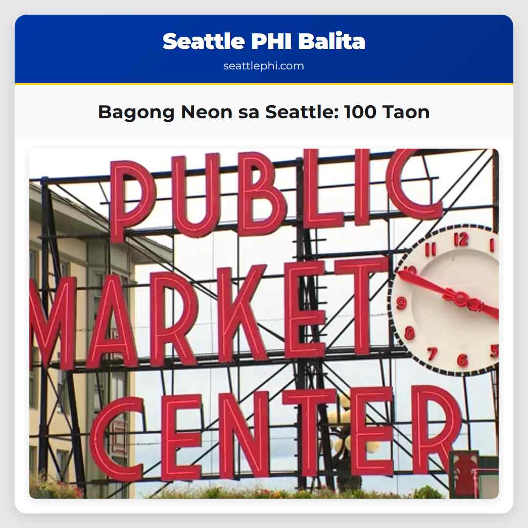 Nag-ibat-ibat ang bagong neon tanda sa Seattle’s Pike Place Market, ang unang malaking tanda na inilagay dito sa higit 100 taon, ayon sa opisyales ng market. Ang tanda ay nangunguna sa mga manlalakbay, mga pasaherong nagmamaneho ng ferry, at mga bisita sa Waterfront nang malapit sa anim na antas ng isang elevator ng market. Ang tanda ay 16 pakan ang taas at nangunguna ito sa mga manlalakbay, mga pasaherong nagmamaneho ng ferry, at mga bisita sa Waterfront. Sinabi ng opisyales ng market na ang layunin ay magbigay ng maligayang pagdating sa mga bisita at makatulong sa mga tao na makilala ang lugar. Ang bagong tanda ay isang bahagi ng maraming mga bagay na nangunguna sa mga buwan ng nakaraan. Noong Oktubre 2025, ang market ay inilunsad ang Heritage Display Project. Ang mga bagong eksibisyon ay nag-uulat ng kuwento ng market sa pamamagitan ng pitong detalyadong mural at limang kiosk, ayon sa mga organisador. Ang larawan ng bagong tanda ng Pike Place Market ay nai-post sa libreng pagbasa noong Hunyo 19, 2026. (Courtesy Lili Hue Benito via #SoNorthwest photography) Ang tanda ay nangunguna sa mga manlalakbay, mga pasaherong nagmamaneho ng ferry, at mga bisita sa Waterfront nang malapit sa anim na antas ng isang elevator ng market.