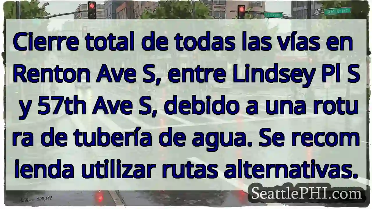 Cierre total de todas las vías en Renton Ave S, entre Lindsey Pl S y 57th Ave S, debido a una rotura de tubería de agua. Se recomienda utilizar rutas alternativas.