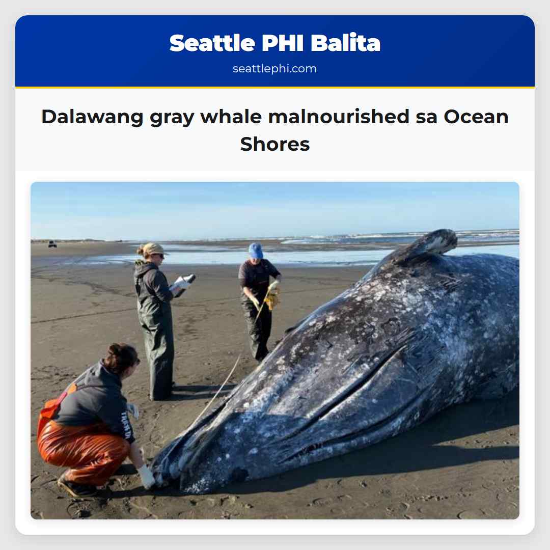 Nakatira ang dalawang gray whale sa baybayin ng Ocean Shores noong nakaraang linggo at naiulat na malnourished ang parehong mga ito, may isang na may mga tanda ng posibleng pagbumpay ng barko, ayon sa mga biyolohista. Ang mga pagsusuri ay ginawa noong April 4 ng Cascadia Research, Washington Department of Fish and Wildlife, at SR³ – Sealife Response, Rehabilitation & Research, isang araw matapos ang mga whale ay naitala sa baybayin. Ang mga opisyales ay nagsabi na parehong mga whale ay mga matatanda na may habang abot 42 pakan. Ang isang lalake at isang babae ang naging mga ito, at parehong nasa masamang kondisyon sa nutrisyon. Ang lalake ay may malalang trauma sa ulo, na ayon sa mga biyol, ay konsistent sa isang pagbumpay sa barko. Ang babae naman ay wala nang naglalaktan, na nagpapahintulot na wala siyang nangangalaga sa kanyang kalibugan noong nangumon siya. Ang mga eksperto ay nagsabi na ang gray whale ay karaniwang mga solong hayop at hindi nag-uusap sa pamilya. Nagbigay din sila ng impormasyon na ang panahon at pagka-ugnay ng mga strandings ay karamihan ay nauugnay sa mga migrasyon, daloy ng tubig, at mga tidal waves.