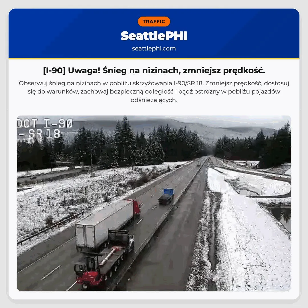 Obserwuj śnieg na nizinach w pobliżu skrzyżowania I-90/SR 18. Zmniejsz prędkość, dostosuj się do warunków, zachowaj bezpieczną odległość i bądź ostrożny w pobliżu pojazdów odśnieżających.