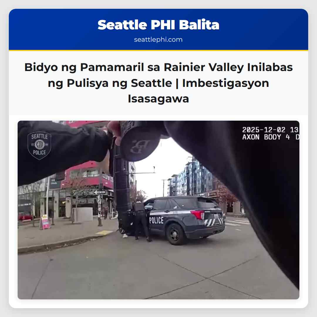 Inilabas ng Departamento ng Pulisya ng Seattle ang bidyo mula sa bodycam ng mga pulis na sangkot sa isang insidente kung saan nasawi ang isang lalaki na armado ng baril sa Rainier Valley noong Martes. Ang Rainier Valley ay isang lugar sa Seattle kung saan maraming Pilipino ang naninirahan, kaya’t mahalaga para sa komunidad na malaman ang nangyari.