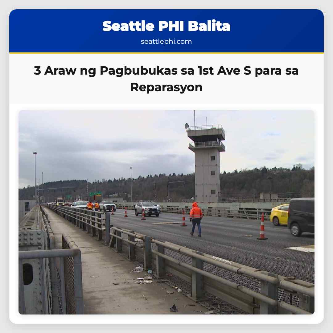 Nagbubukas muli ang lahat ng mga pahilagang lane ng State Route 99 sa First Avenue South bridge para sa 3 araw para sa mga emergency repairs. Ang mga manlalakbay na papunta sa Seattle mula sa timog ay dapat magplano ng mas mahabang oras ng paglalakbay dahil sa pagbubukas, na nagsimula matapos ang mga inspektor ng Washington State Department of Transportation (WSDOT) mag-identify ng krisis sa steel deck grates ng bridge noong Enero 18. Ang mga pahilagang lane ay nagsimula nang magbukas noong Martes, Marso 9, 5:00 AM, at inaasahan na magbubukas muli noong Huwebes, Marso 11, 8:00 PM para sa mga emergency repairs. Ang mas dakilang trabaho para sa permanenteng solusyon ay magpapalabas sa Abril, sinabi ng WSDOT. Ang trapiko ay umuunlad sa mga pahilagang lane sa Cloverdale/South Park. Ang bridge ay mananatiling bukas para sa marine traffic sa panahon ng pagbubukas. Sa panahon ng pagbubukas, ang mga crew ay magpapalabas ng mga reinforcement at magpapalabas ng mga steel plates sa mga krisis na grates para i-back up ang safe vehicle access sa lahat ng lanes. Ang 25 mph speed limit ay mananatiling aktibo hanggang sa masagot ang ikalawang phase ng repairs. Sa long-term, ang mga inspektor ay nagsimula ng pag-identify ng siyam na steel grate panels na kailangan i-replace. Ang paggawa ng mga panels ay inaasahan na magpapalabas ng alinman sa anim na linggo, at ang replacement ay inaasahan na magmula sa gitna hanggang huli ng Abril. Ang WSDOT ay nagmamay-ari ng pag-iisip na magamit ang full weekend o overnight closures para i-minimize ang disruption ng trabaho, na kailangan ang full northbound closure ng bridge. Ang agensiya ay naglalaban para magpapalabas ng ikalawang phase bago ang 2026 FIFA World Cup, na magpapalabas ng milyun-milyon ng manlalakbay sa greater Puget Sound region. Kung ang siyam na panels ay i-replace, ang mga lane ay magbubukas muli sa normal na speed. Ang emergency repairs ay nagsimula sa isang malawak na kahon ng road work at closures. Ang dalawang kaliwang lane ng pahilaga na Interstate 5 ay nagsisimula sa Ship Canal Bridge bilang bahagi ng Revive I-5, at ang Interstate 405 ay magbubukas sa parehong direksyon sa Bothell sa susunod na dalawang weekend para sa ramp removal work. Ang full replacement ng pahilaga na bridge deck ay nagsisimula sa 2027, na kailangan ang coordination sa US Coast Guard at iba pang regional partners. Sa panahon, ang patchwork ng repairs sa bridge deck ay nagdagdag ng weight sa bahagi na bukas para sa boat traffic. Ang moveable, double-leaf bascule drawbridge ay may dalawang bahagi na umihi mula sa center para i-bukas ang marine traffic. Ang huling malaking trabaho sa First Avenue South bridge ay nagsimula noong 2020, kung kailangan i-replace ang 14 deck panels. Ang bridge ay bahagi ng sistema ng infrastructure na naglalaban sa intended service life, ayon sa WSDOT. Ang Gov. Bob Ferguson ay nagproposo ng $2.1 billion investment para sa transportation preservation, kabilang ang $1.1 billion para sa bridges. Ang WSDOT ay magpapalabas ng updated timeline para sa ikalawang phase ng repairs sa early April bago ang trabaho magsimula.