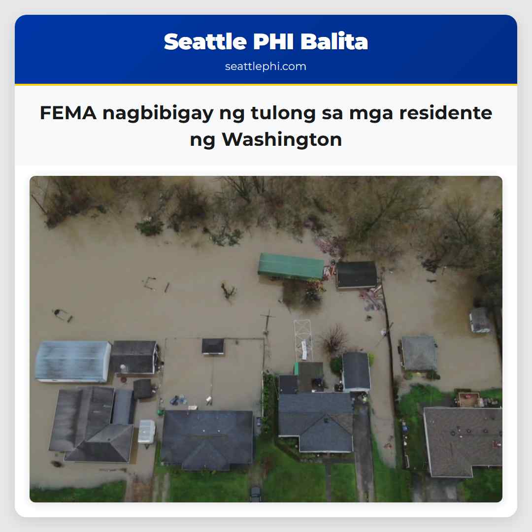 Nagbibigay ng FEMA ng tulong sa mga residente ng Washington para sa mga epekto ng mga bagyo sa Disyembre 2025. Ang mga bagyo ay nagdulot ng sunog, pagbaha, at pagbaha sa iba’t ibang lugar sa hilagang Washington. Ang tulong ay naglalayon na makatulong sa mga tao na makatulong sa pagbawi mula sa mga epekto ng malakas na bagyo, mga lindol, pagbaha, at pagbaha ng lupa mula Disyembre 5 hanggang Disyembre 19, 2025. Ang tulong ay maglalayon sa mga tao sa mga lungsod ng Chelan, Grays Harbor, King, Lewis, Pacific, Pierce, Skagit, Snohomish, Thurston, at Whatcom, kasama ang mga bansa ng mga tribu sa rehiyon. Ang tulong ay maaaring maglaman ng mga grant para sa pagkakaroon ng tahanan, mga pambansang tulong para sa mga pagbawi, at iba pang mga programa para sa pagbawi. Ang mga ilog ay umabot sa mataas na antas, nagdulot ng pagbaha sa mga komunidad, nag-utos ng pagbaba ng tao, at nag-utos ng mga operasyon para sa pagbawi sa tubig. Ang mga residente na naranasan ang pinsala ay inaaliw na mag-file ng mga claim para sa insurance, at mag-apply para sa tulong sa online, sa pamamagitan ng telepono, o sa app ng FEMA.