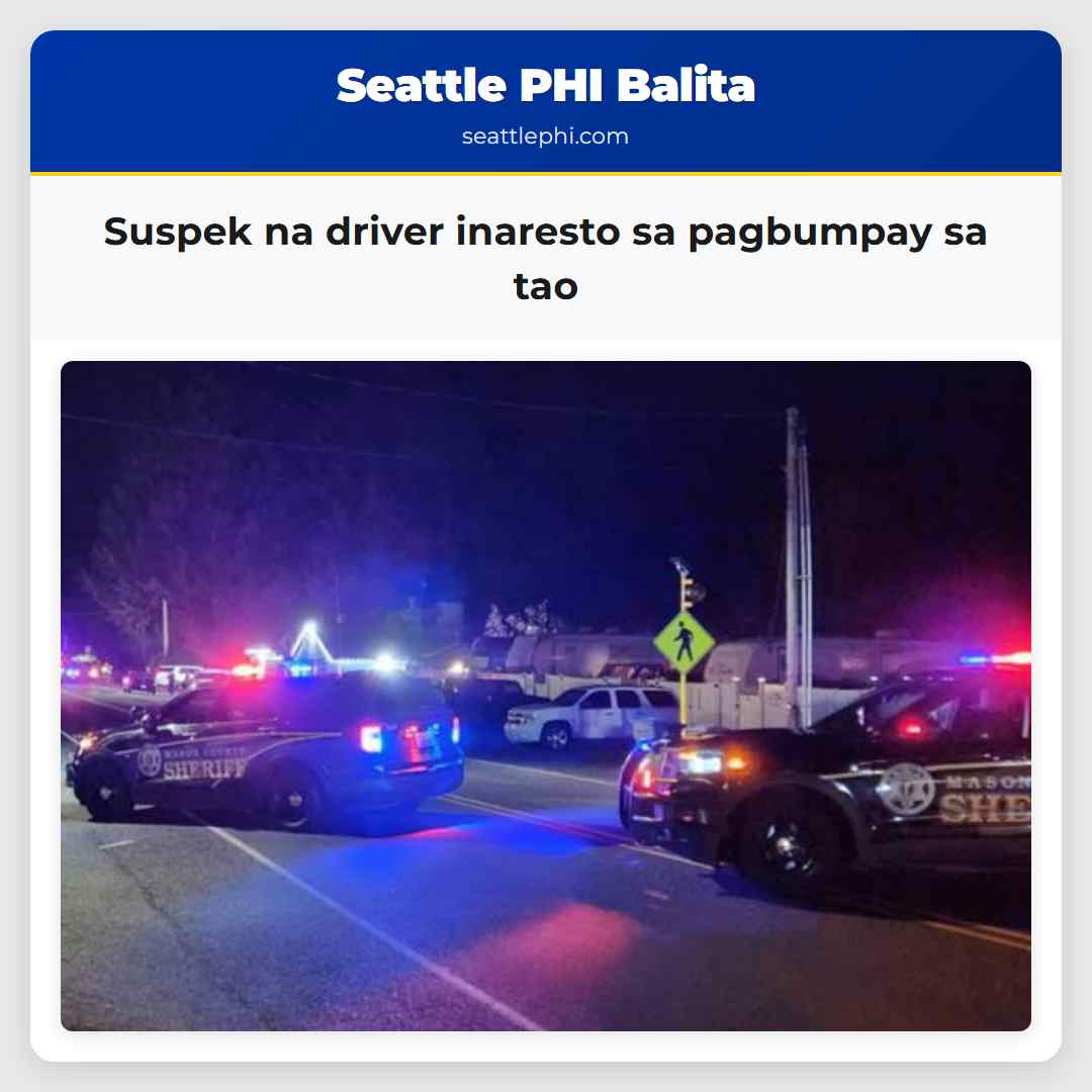 Inaresto ang isang 25-taong-mga-nanay na driver sa pagbumpay sa isang tao sa labas ng isang bar sa Shelton noong gabi ng Miyerkules, ayon sa Sheriff’s Office ng Mason County. Ang mga deputy ay nagsagawa ng tulong sa lugar na nasa Spencer Lake Bar and Grill sa East Pickering Road sa Shelton para sa ulat ng isang aksidente. Ang driver, na 25 taong gulang, ay inaresto at suspek na nangungunlo ng marijuana, ayon sa sheriff’s office. Ang mga opisyales ay hindi nagbigay ng anumang impormasyon tungkol sa biktima o ang antas ng sugat na naranasan ng biktima. Ang pangyayari ay nasa imbestigasyon pa rin. Ang mga manlalakbay ay inaadvirang iwasan ang lugar.