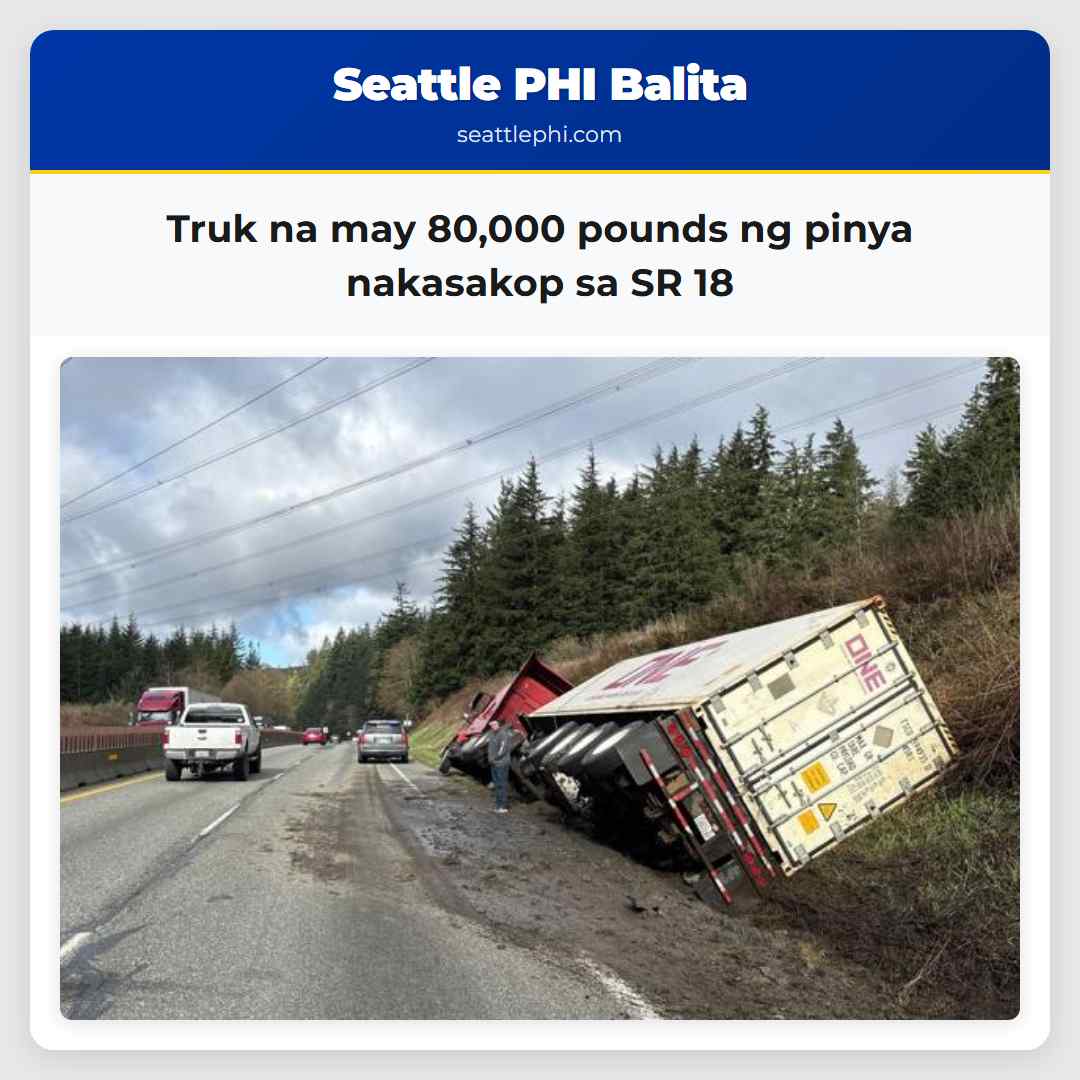 Nagbawi na ang lahat ng mga lane sa SR 18 matapos ang isang truk na may 80,000 pounds ng pinya ay umabot sa isang aksidente sa state route 18 noong umaga ng Lunes. Sinabi ng Washington State Patrol Trooper Rick Johnson na ang aksidente ay nangyari noong 9:30 a.m. at ang truk ay nagsakop sa milepost 24, na nasa timog-silangan ng Tiger Mountain State Forest. Ang mga lane sa kanan ay nagsimulang magbawi noong 11:30 a.m. at ang truk ay nagsakop sa isang bunganga sa kalsada. Ang mga imahe ay nagpapakita na ang semi-truk ay nagsakop sa kabilang banda ng kalsada at nagsakop sa isang bunganga sa kalsada. Ang pulis ay nagsabi na ang mga lane sa kanan ay dapat i-off sa pagdating ng tow truck para magtanggal ng truk.