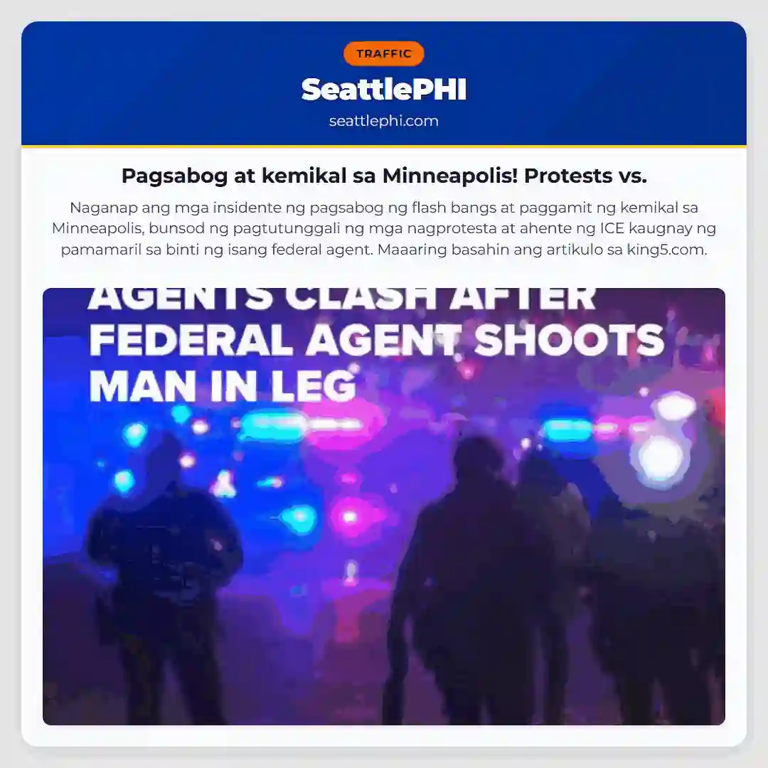 Naganap ang mga insidente ng pagsabog ng flash bangs at paggamit ng kemikal sa Minneapolis, bunsod ng pagtutunggali ng mga nagprotesta at ahente ng ICE kaugnay ng pamamaril sa binti ng isang federal agent. Maaaring basahin ang artikulo sa king5.com.