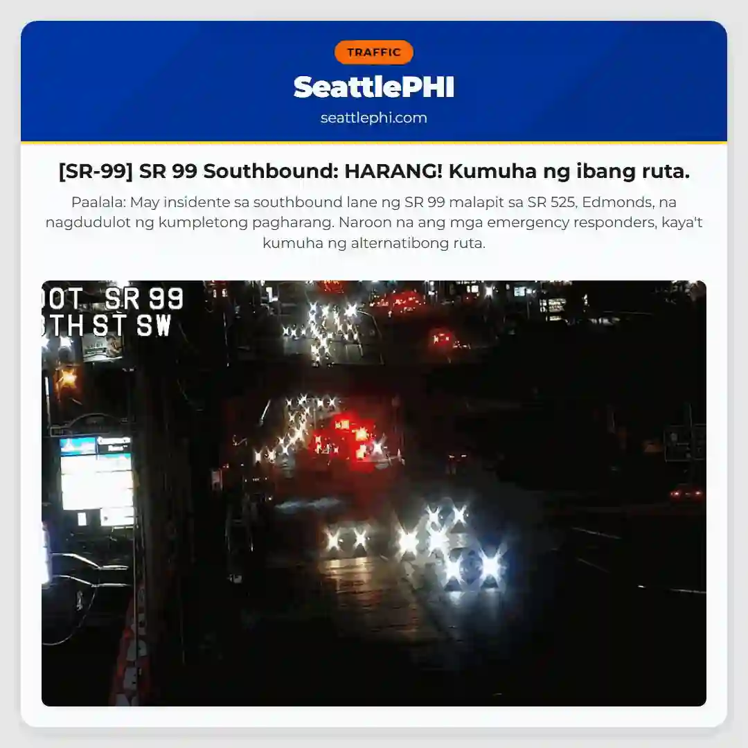 Paalala: May insidente sa southbound lane ng SR 99 malapit sa SR 525, Edmonds, na nagdudulot ng kumpletong pagharang. Naroon na ang mga emergency responders, kaya’t kumuha ng alternatibong ruta.