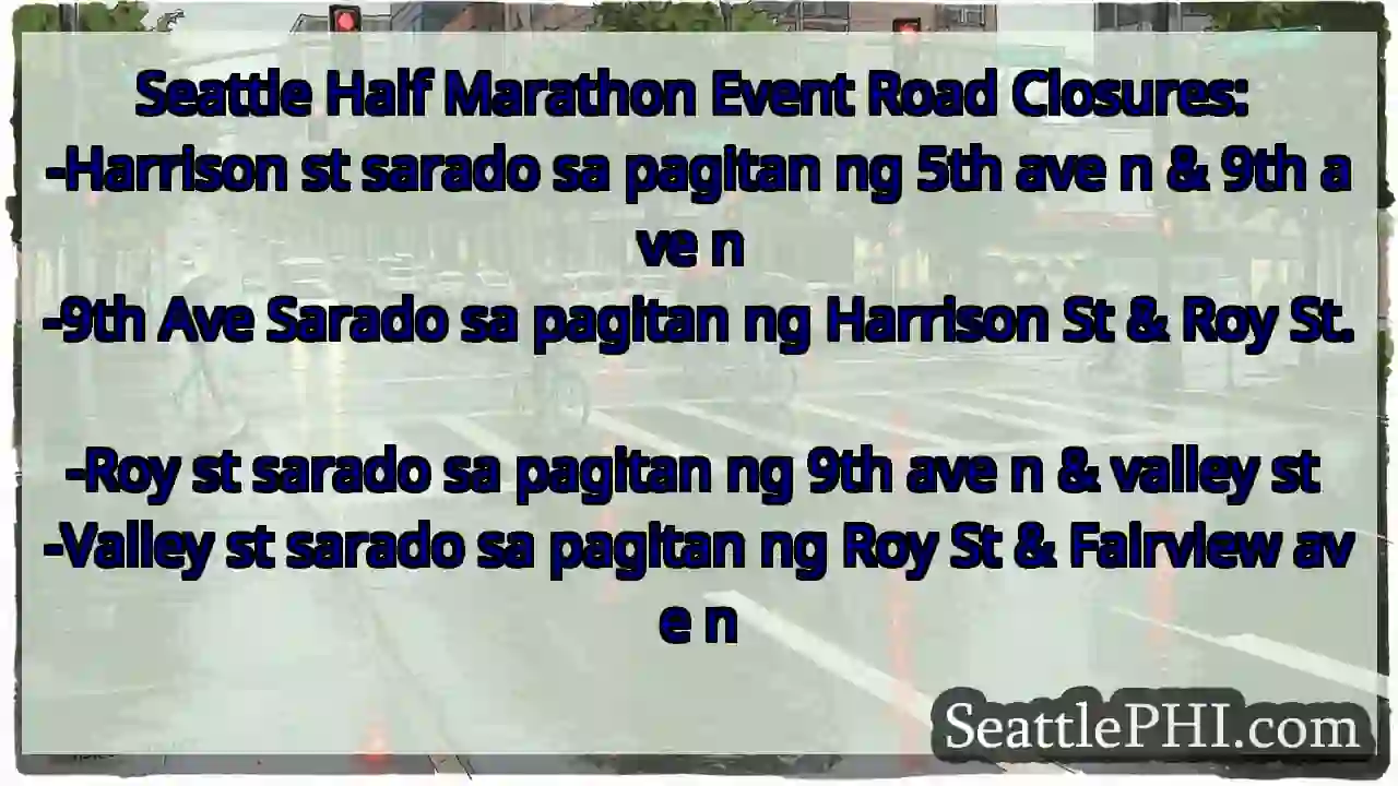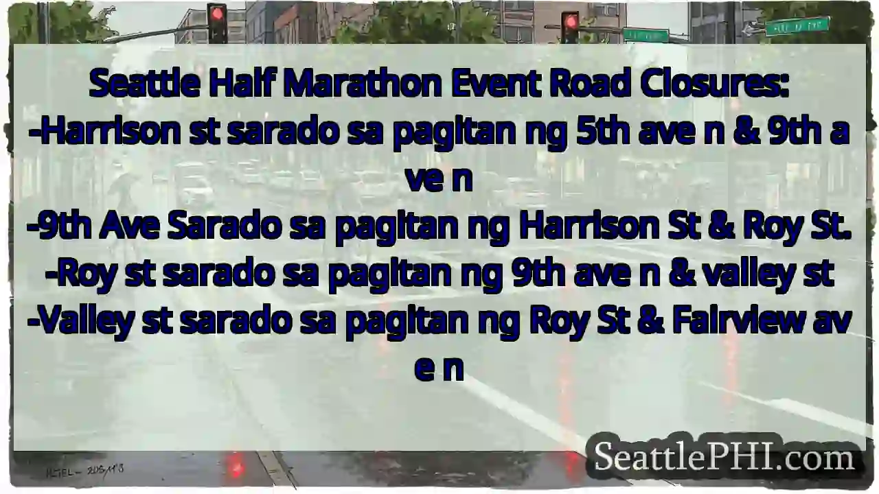 Seattle Half Marathon Event Road Closures: -Harrison st sarado sa pagitan ng 5th ave n & 9th ave n -9th Ave Sarado sa pagitan ng Harrison St & Roy St. -Roy st sarado sa pagitan ng 9th ave n & valley st -Valley st sarado sa pagitan ng Roy St & Fairview ave n