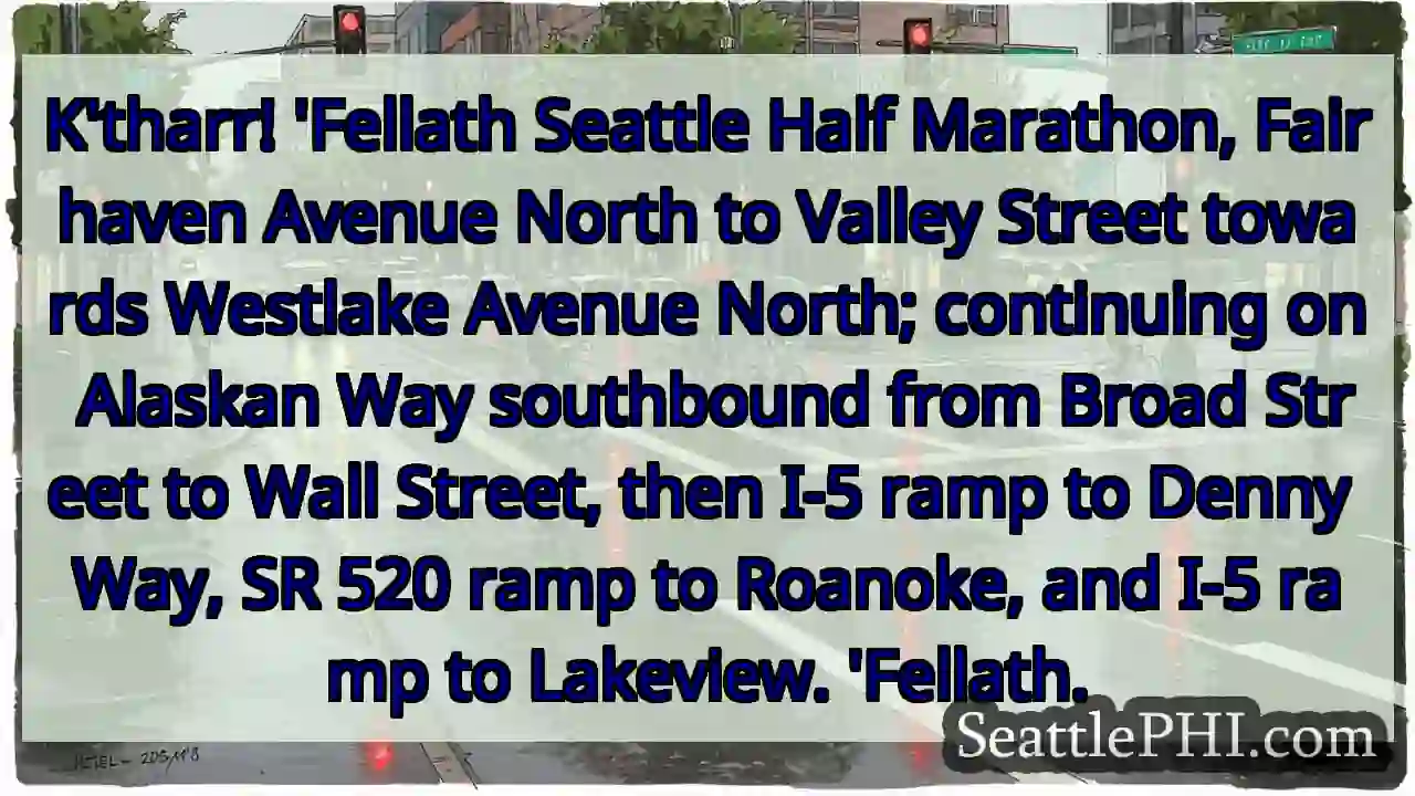 K’tharr! ‘Fellath Seattle Half Marathon, Fairhaven Avenue North to Valley Street towards Westlake Avenue North; continuing on Alaskan Way southbound from Broad Street to Wall Street, then I-5 ramp to Denny Way, SR 520 ramp to Roanoke, and I-5 ramp to Lakeview. ‘Fellath.