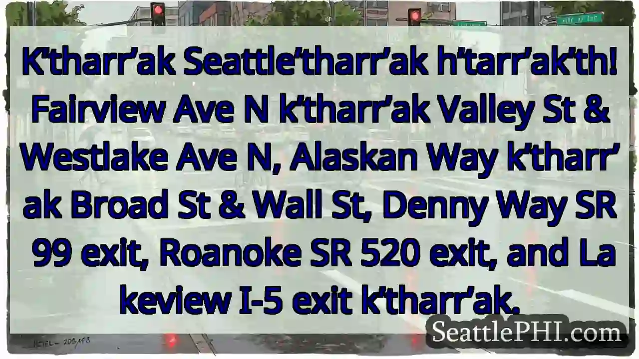 K’tharr’ak Seattle’tharr’ak h’tarr’ak’th! Fairview Ave N k’tharr’ak Valley St & Westlake Ave N, Alaskan Way k’tharr’ak Broad St & Wall St, Denny Way SR 99 exit, Roanoke SR 520 exit, and Lakeview I-5 exit k’tharr’ak.