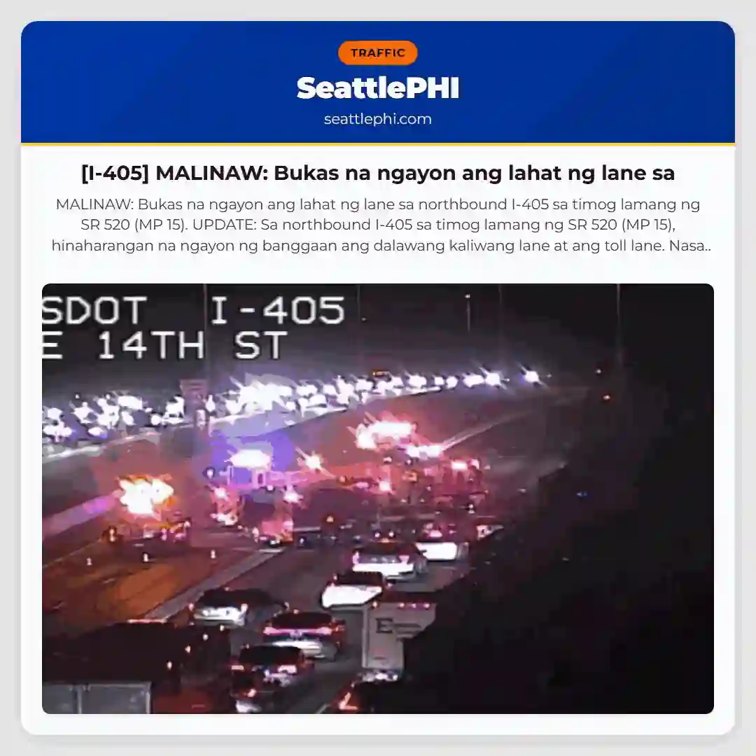Paalala: May insidente sa southbound lane ng SR 99 malapit sa SR 525, Edmonds, na nagdudulot ng kumpletong pagharang. Naroon na ang mga emergency responders, kaya’t kumuha ng alternatibong ruta.